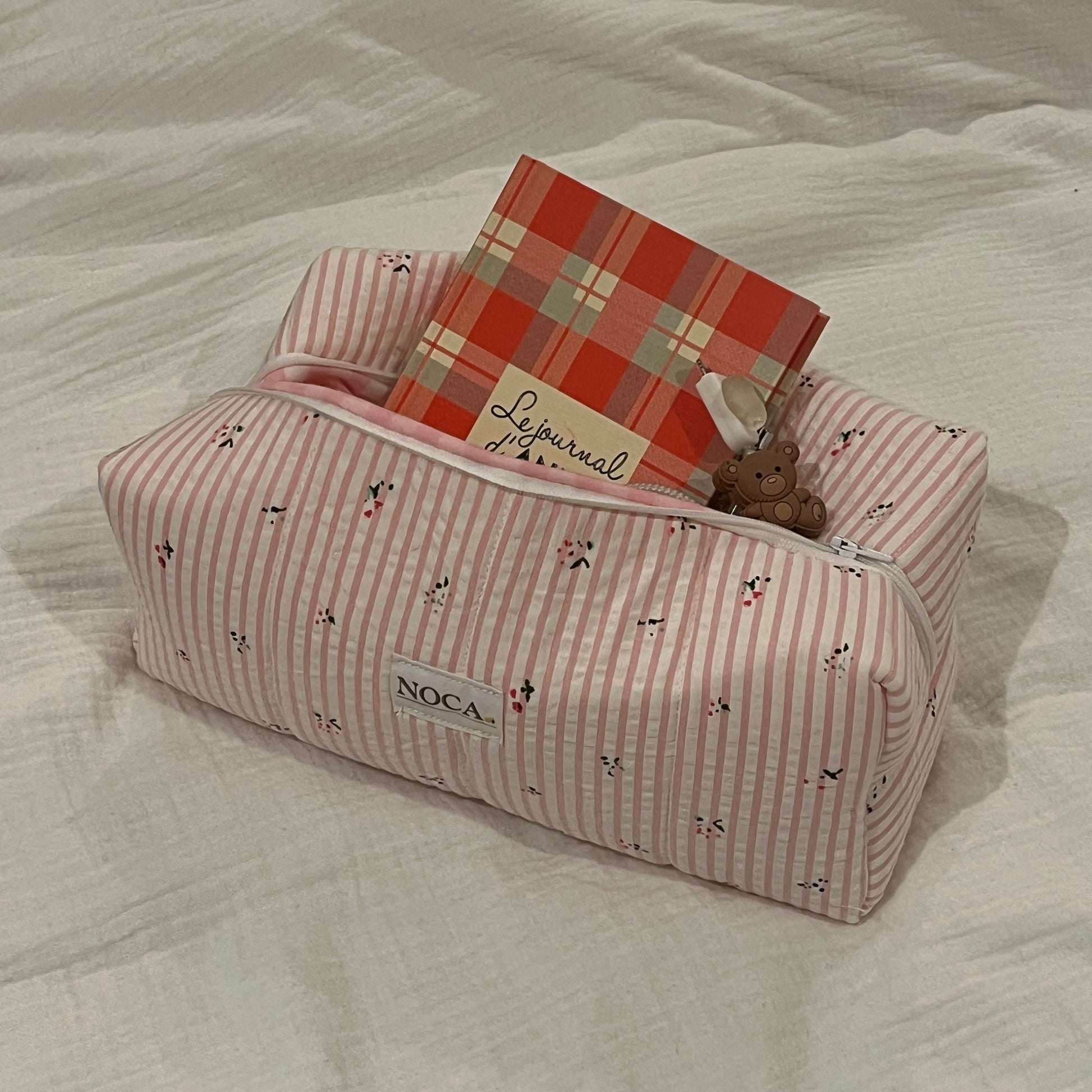 Trousse à rayures roses en blanches avec petites fleurs & intérieur vichy rose.